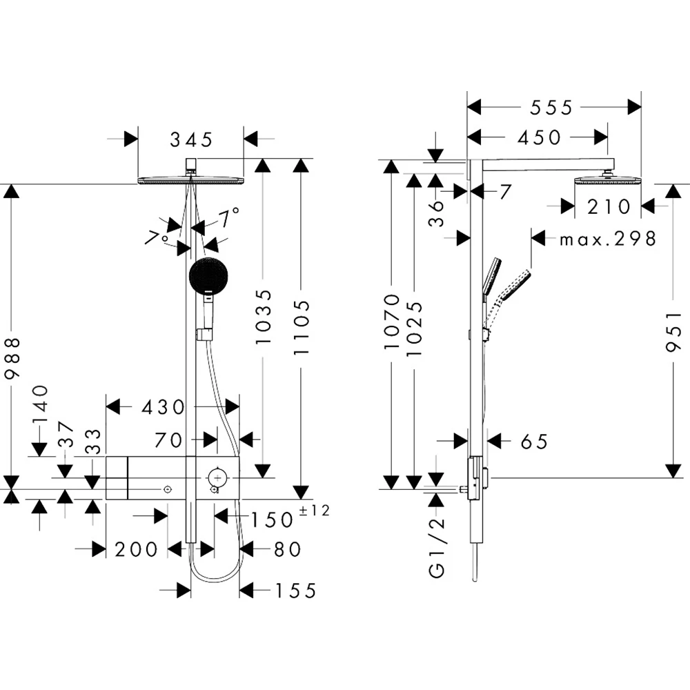 • Duş kolonu için maksimum akış miktarı, 3 bar basınçta: 7 l/dk
